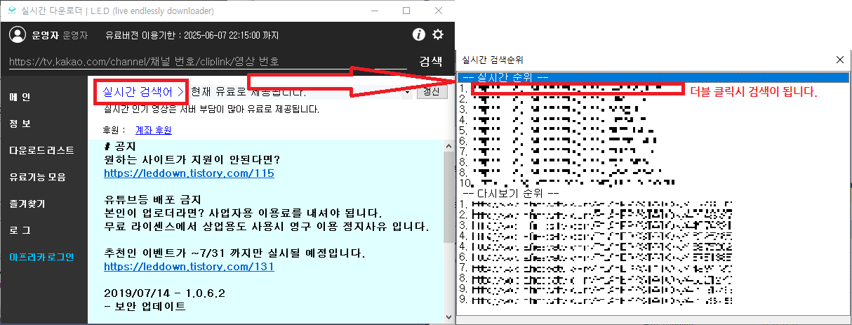 파란색 "실시간 검색어" 클릭시 새로운 창이 뜨며, 더블클릭시 검색화면으로 넘어갑니다.