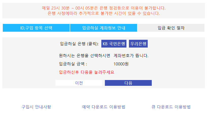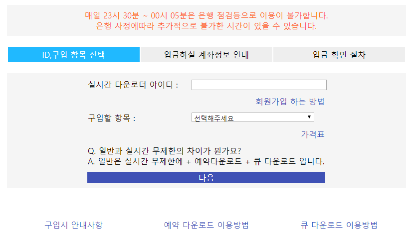 3. 다운로더 아이디와 구입하고싶은 항목을 선택후 다음을 누릅니다.