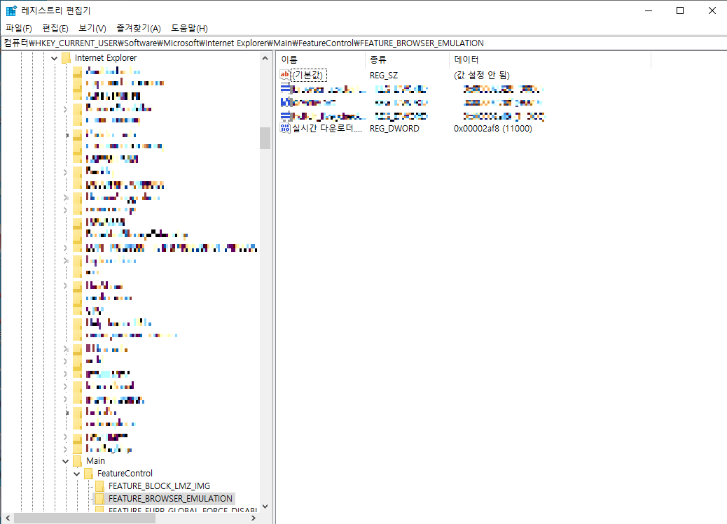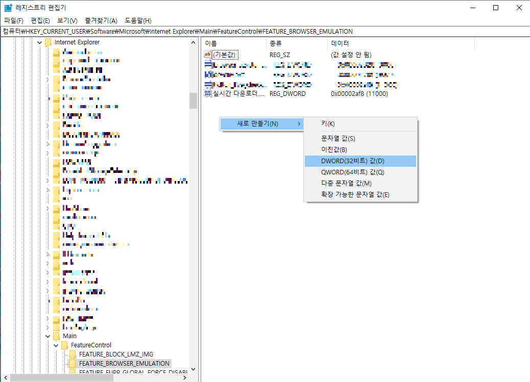 이렇게 하셔도 안되신다면 주소를 "컴퓨터\HKEY_CURRENT_USER\Software\Wow6432Node\Microsoft\Internet Explorer\MAIN\FeatureControl\FEATURE_BROWSER_EMULATION"로 변경하신 후 2번부터 재시도 해보세요