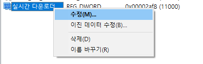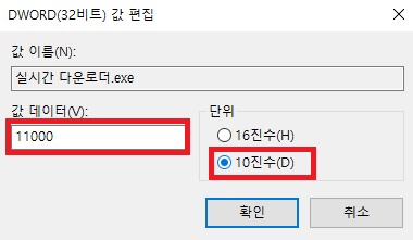 6. 단위를 10진수로 바꾼뒤 값 데이터에 11000을 입력하시면 IE11 버전으로 트위치를 로딩하기 때문에 정상적으로 실행가능합니다.