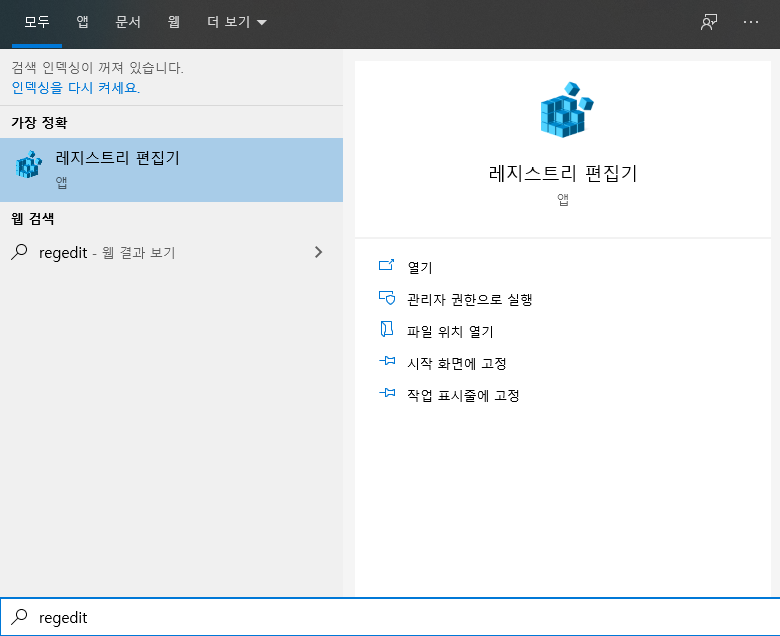 1. 윈도우 검색버튼 (또는 키보드 윈도우키 + R) 으로 regedit를 검색합니다.