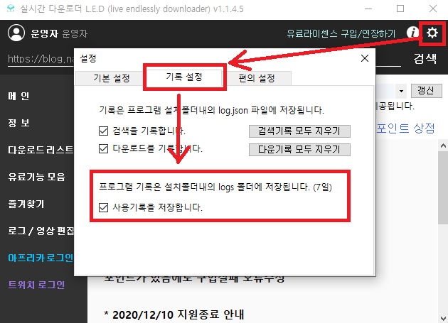 프로그램 설치폴더\logs 에 로그파일이 저장되며, 설정에서 켜고 끌 수 있습니다.