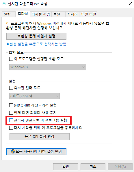 1. 프로그램 설치폴더(기본: C:\Program Files (x86)\LEDown)에서 실시간 다운로더.exe의 속성(우클릭 - 속성)에 들어갑니다.