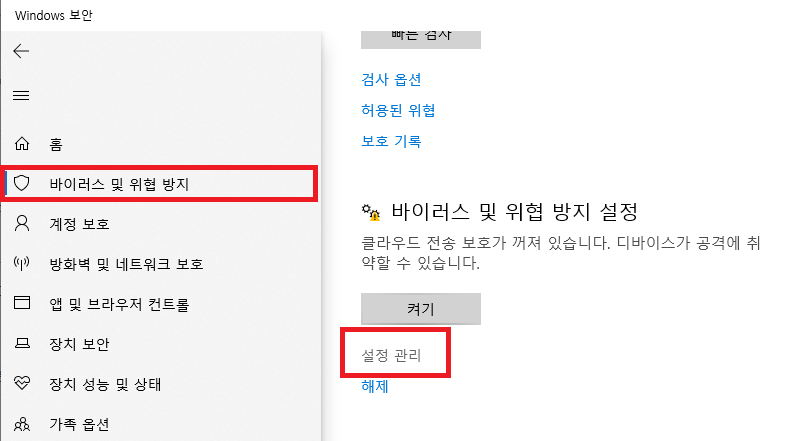 2. 바이러스 및 위협 방지에서 설정 관리에 들어갑니다.