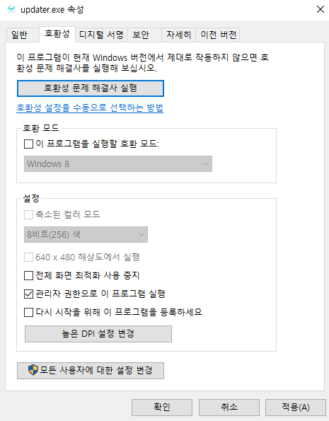 2. 호환성 탭에서 관리자 권한으로 실행을 켭니다.